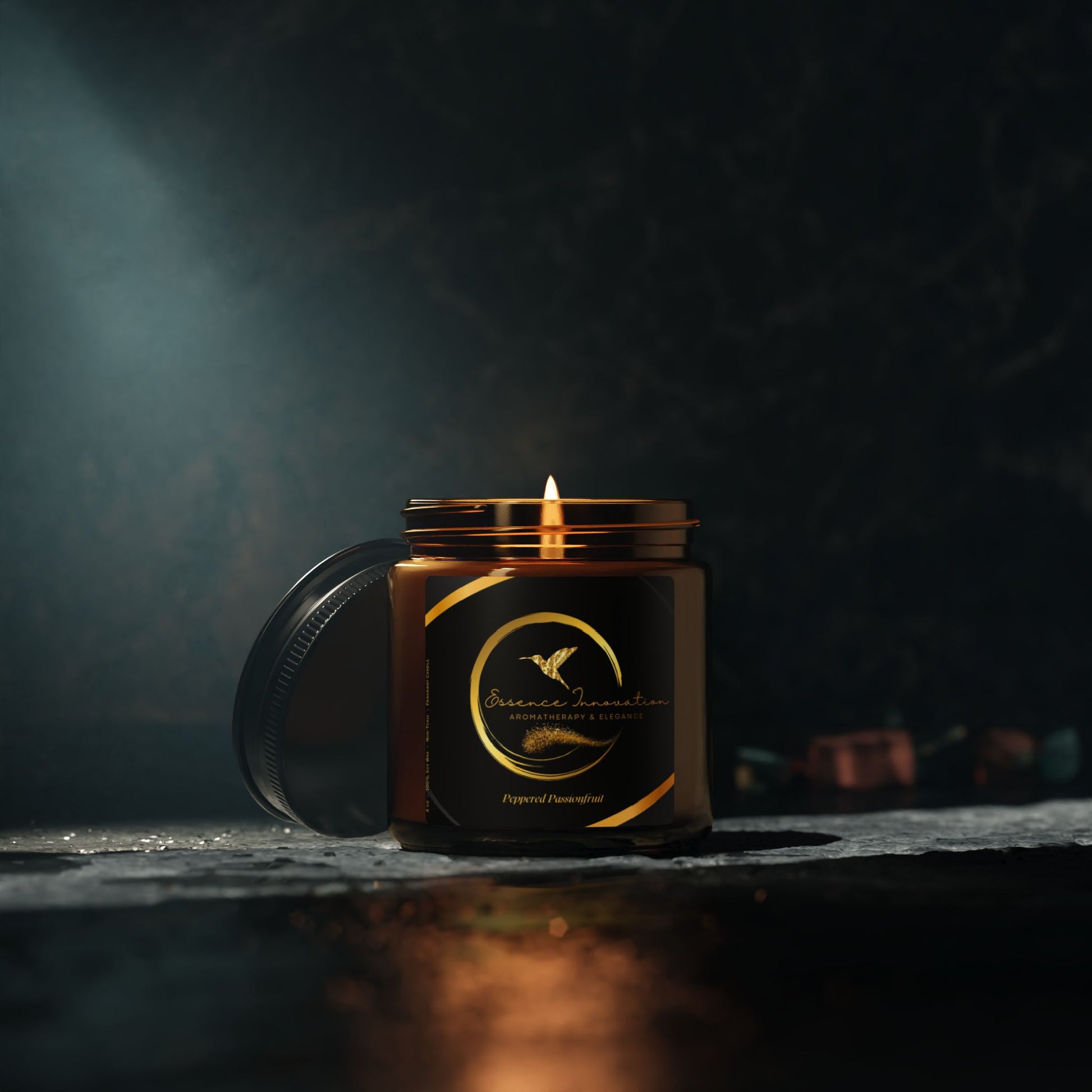 Poured into a sleek amber glass jar with a matte black lid