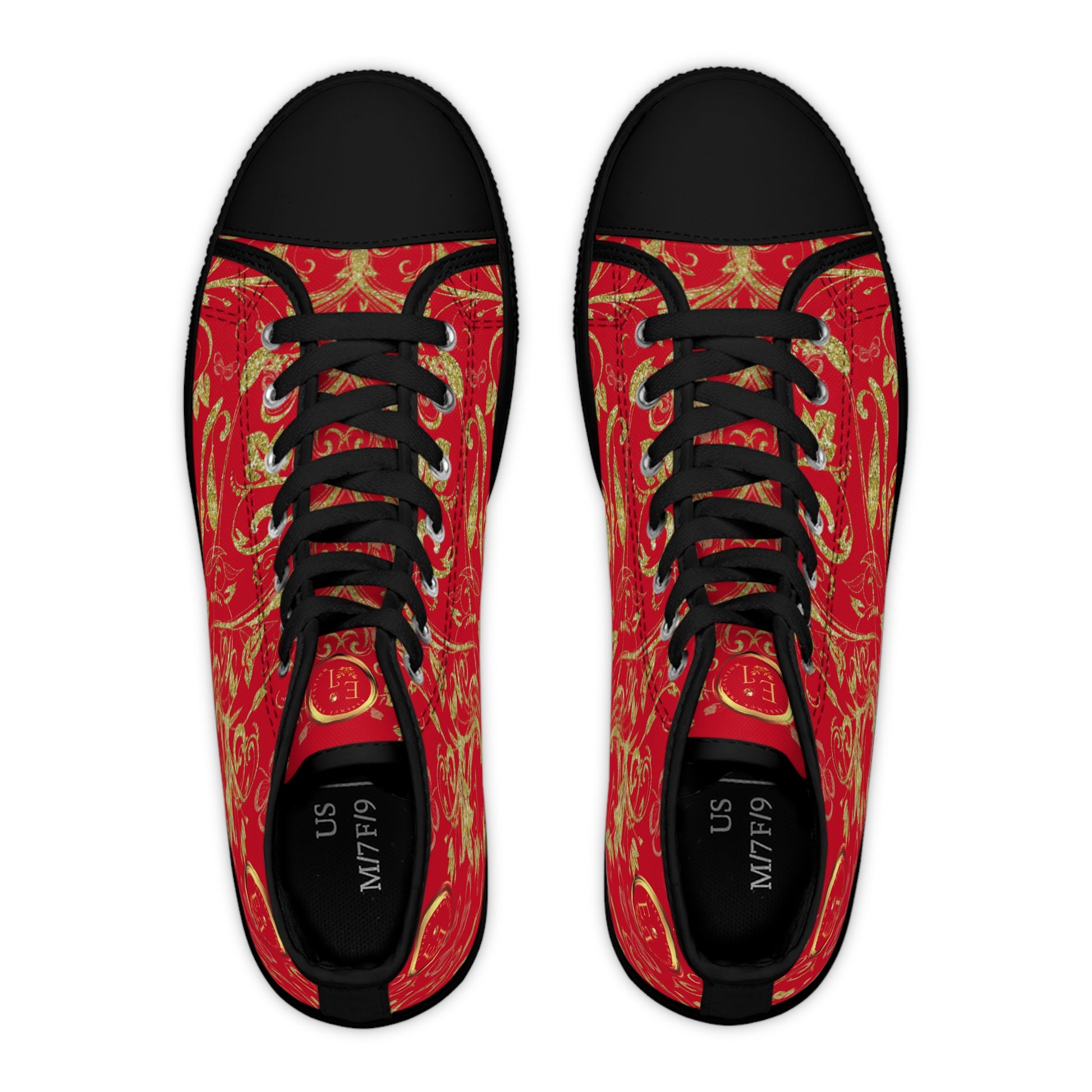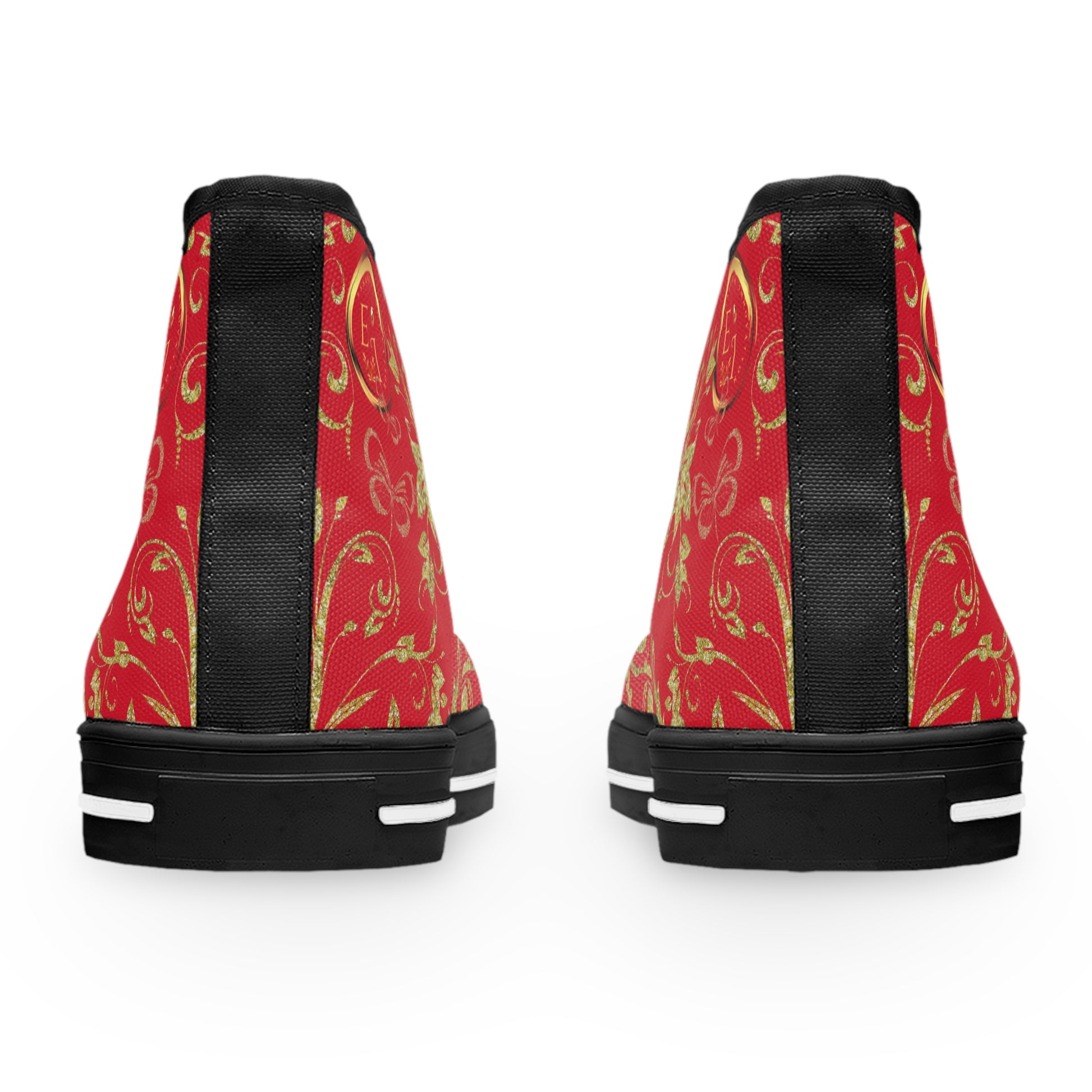 Step into a world of elegance, creativity, and love with the Bohemian Butterfly Heart Black Sole HighTop Sneakers. Designed for free spirits and trendsetters, this stunning collection features intricate golden floral and butterfly patterns with an exclusive heart and butterfly emblem on the tongue—a truly artistic and meaningful touch.