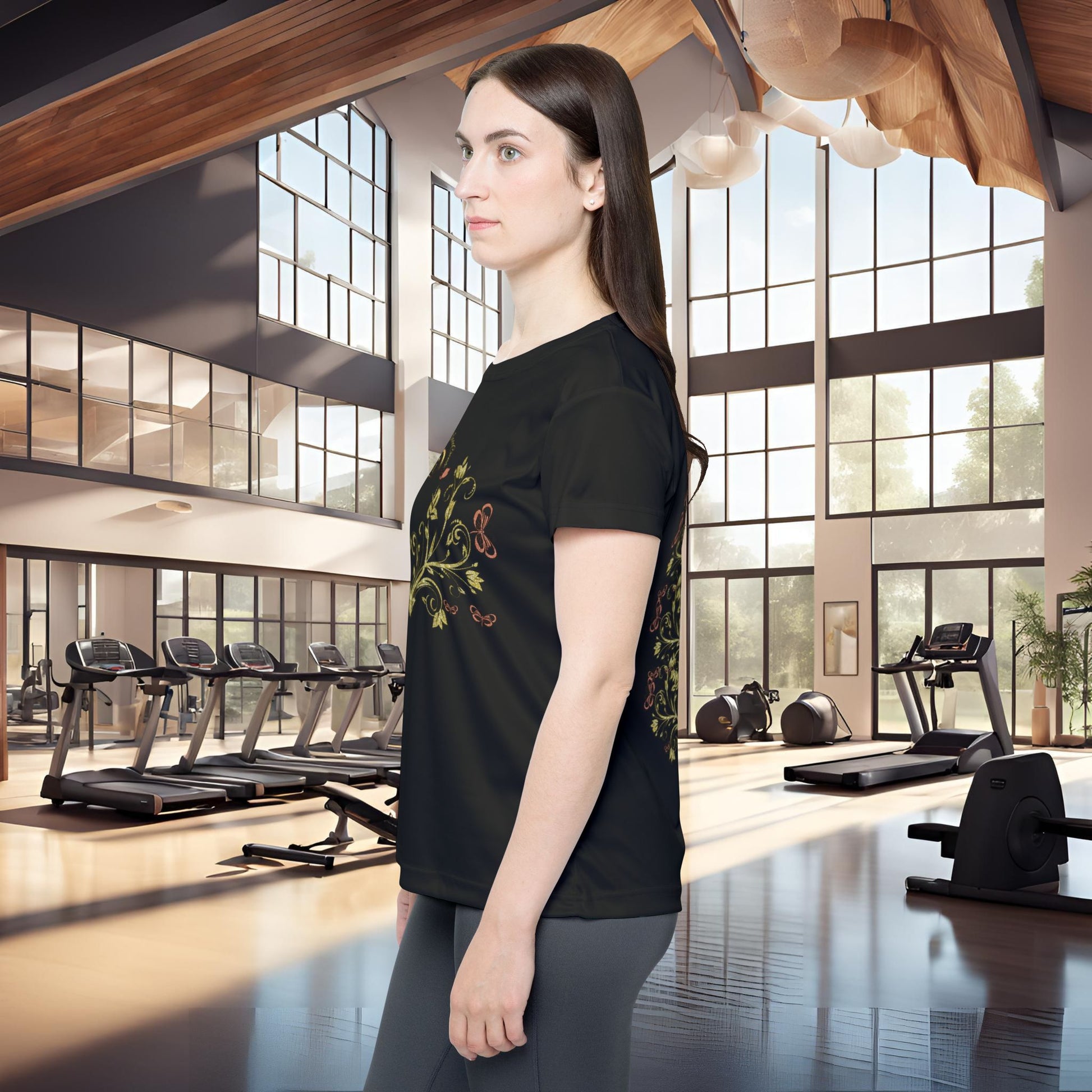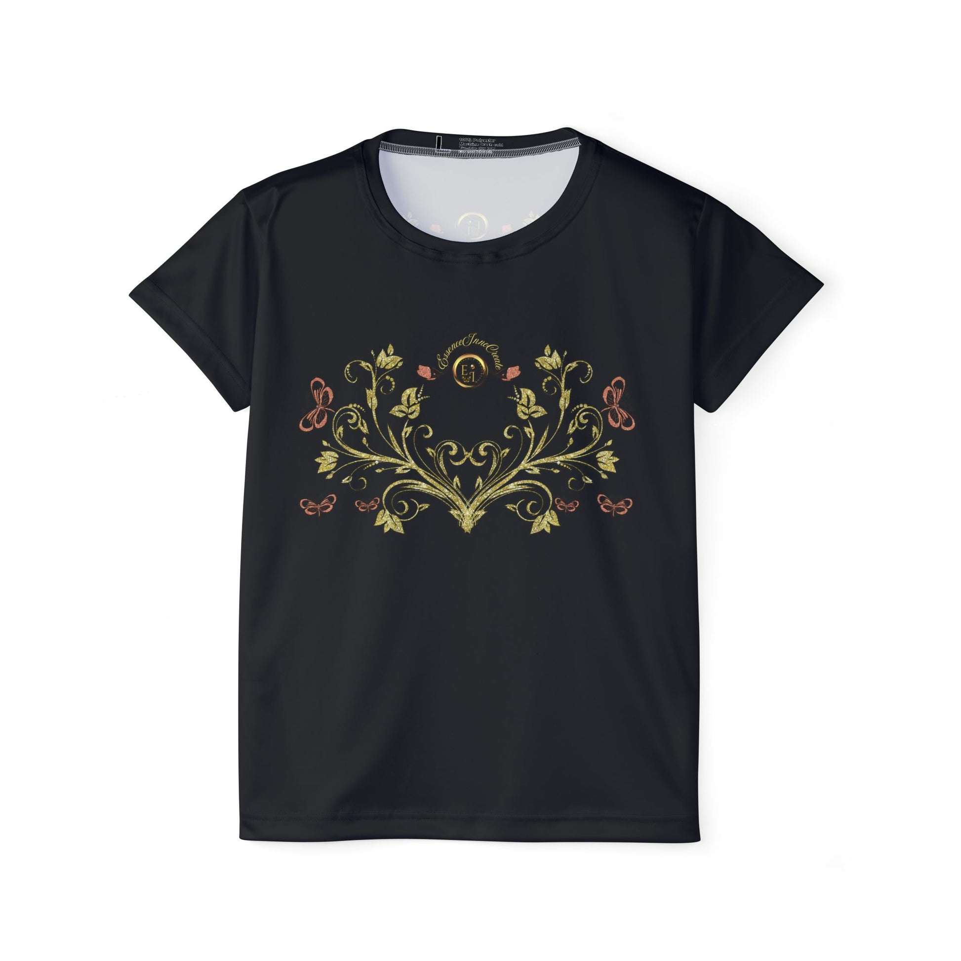 The Butterfly Blossom Tee VII | EssenceInnoCreate | Black transforms wearable art into a daily ritual. Its front design showcases golden blooms, butterflies, and vines—symbols of creativity and renewal. Heart-shaped motifs weave through the artwork, reflecting the deep emotion and soulful detail that define the Butterfly Blossom series.
