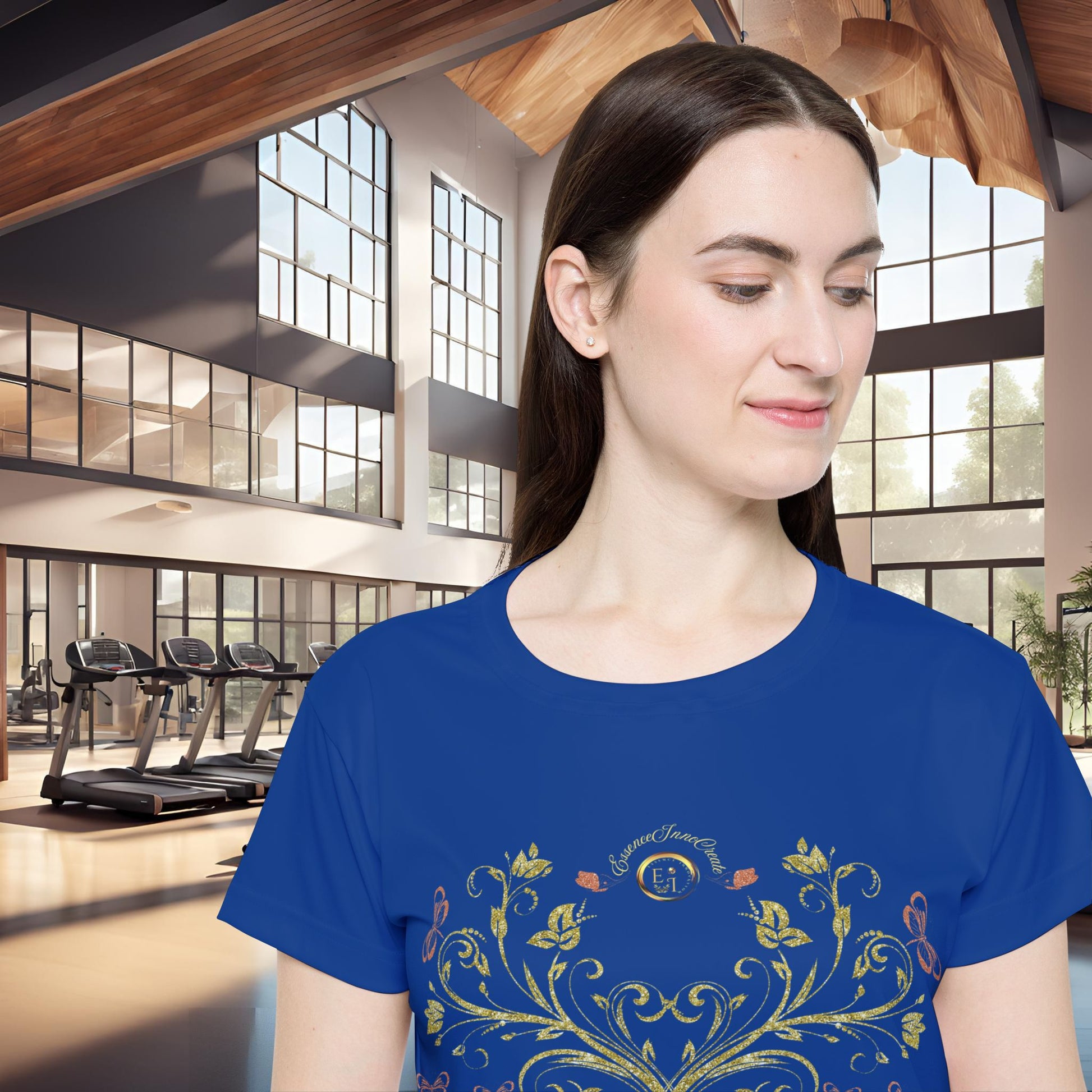 The Butterfly Blossom Tee XIII | EssenceInnoCreate | Dark Blue embodies sophistication and calm strength. Its golden butterflies, vines, and floral motifs shine against a rich blue base, symbolizing confidence, creativity, and timeless beauty. This design invites balance while adding a regal touch to everyday wear.