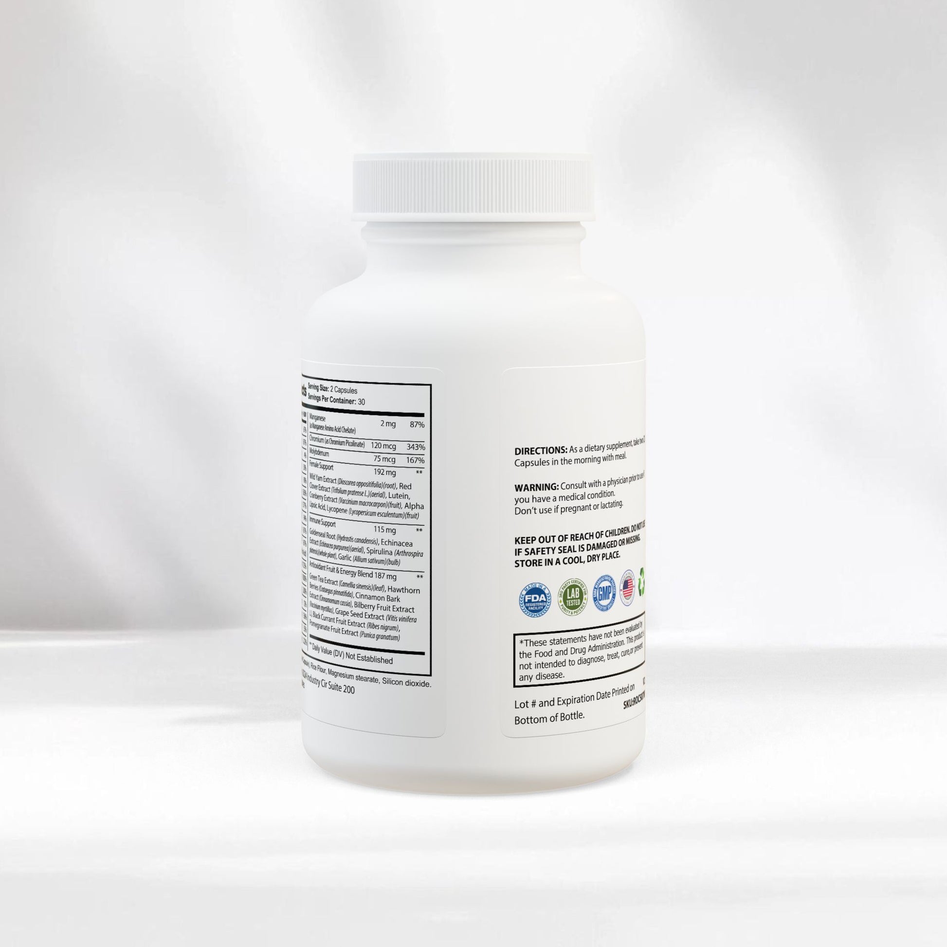 - Ingredients: Vitamin A (Beta-Carotene), Vitamin C (Ascorbic Acid), Calcium (Calcium Carbonate), Vitamin D (Cholecalciferol), Vitamin E (DL-Alpha Tocopherol Acetate), B-Complex (B1, B2, B3, B6, B12), Folate, Biotin, Vitamin B5, Magnesium, Zinc, Selenium, Copper, Manganese, Chromium, Molybdenum, Wild Yam Extract, Red Clover Extract, Lutein, Cranberry Extract, Alpha Lipoic Acid, Lycopene, Spirulina, Garlic, Green Tea Extract, Hawthorn Berries, Cinnamon Bark Extract, Grape Seed Extract, Black Currant, Pomegranate, and other botanical extracts. Inactive Ingredients: Cellulose (Vegetable Capsule), Rice Flour, Magnesium Stearate, Silicon Dioxide.