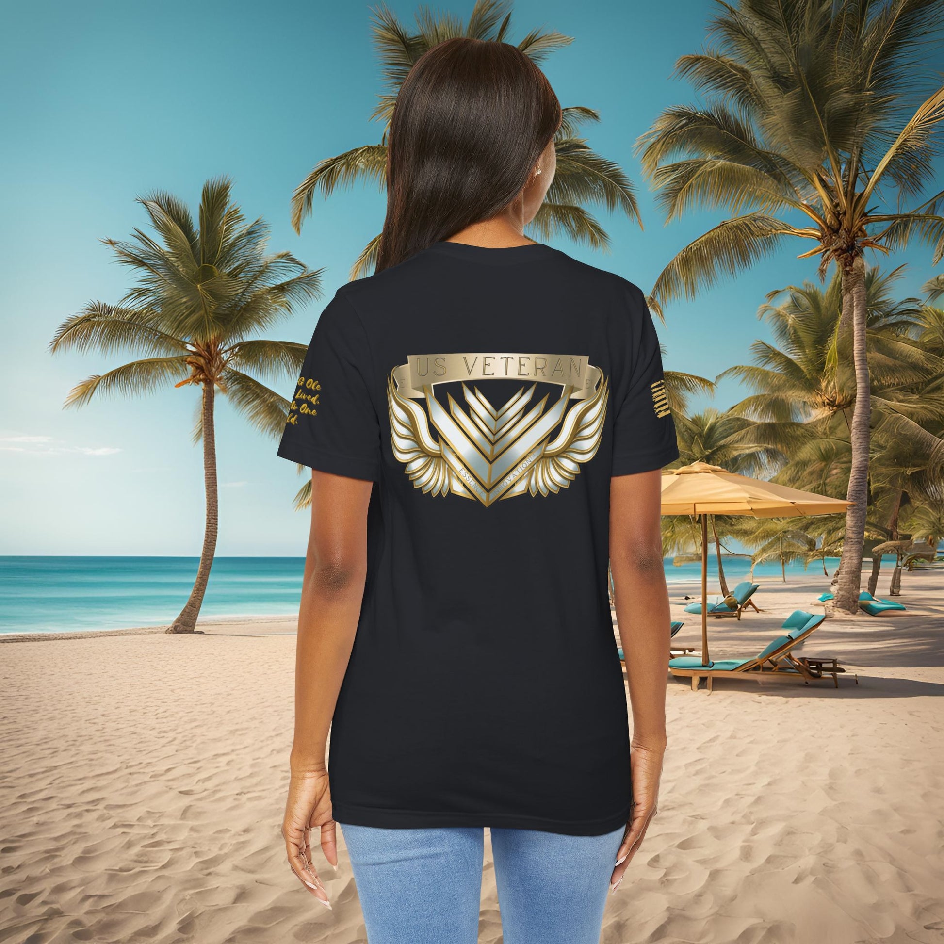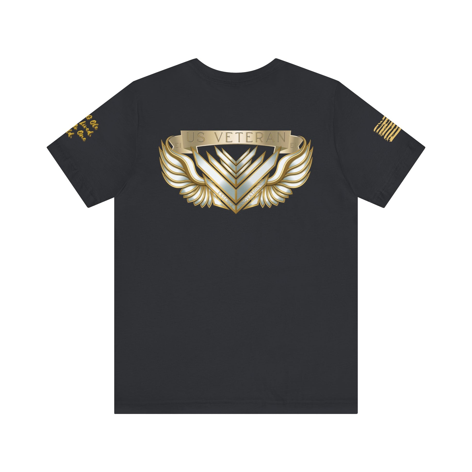 Across the chest rests our gold US VETERAN emblem. Just beneath it, the quote reads: