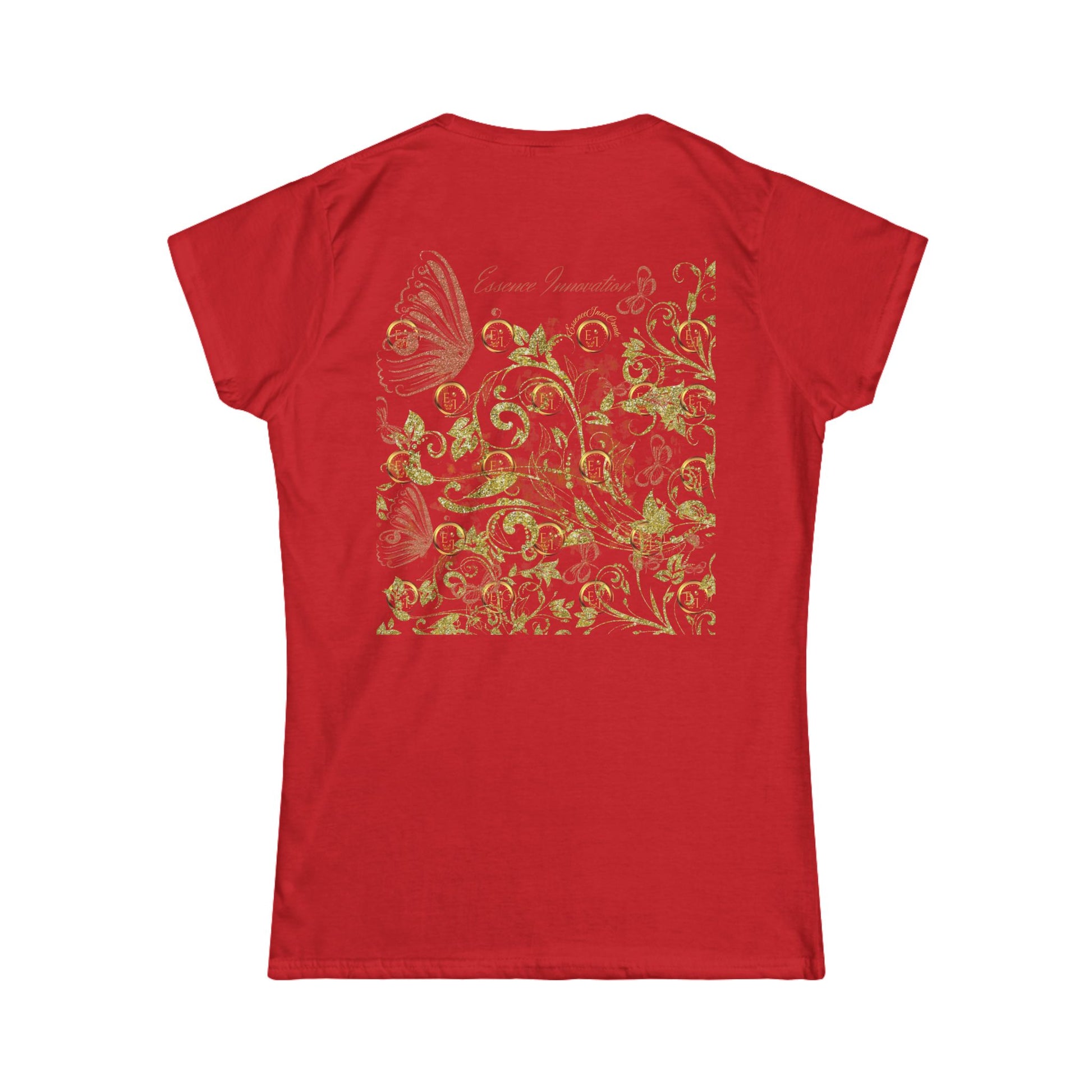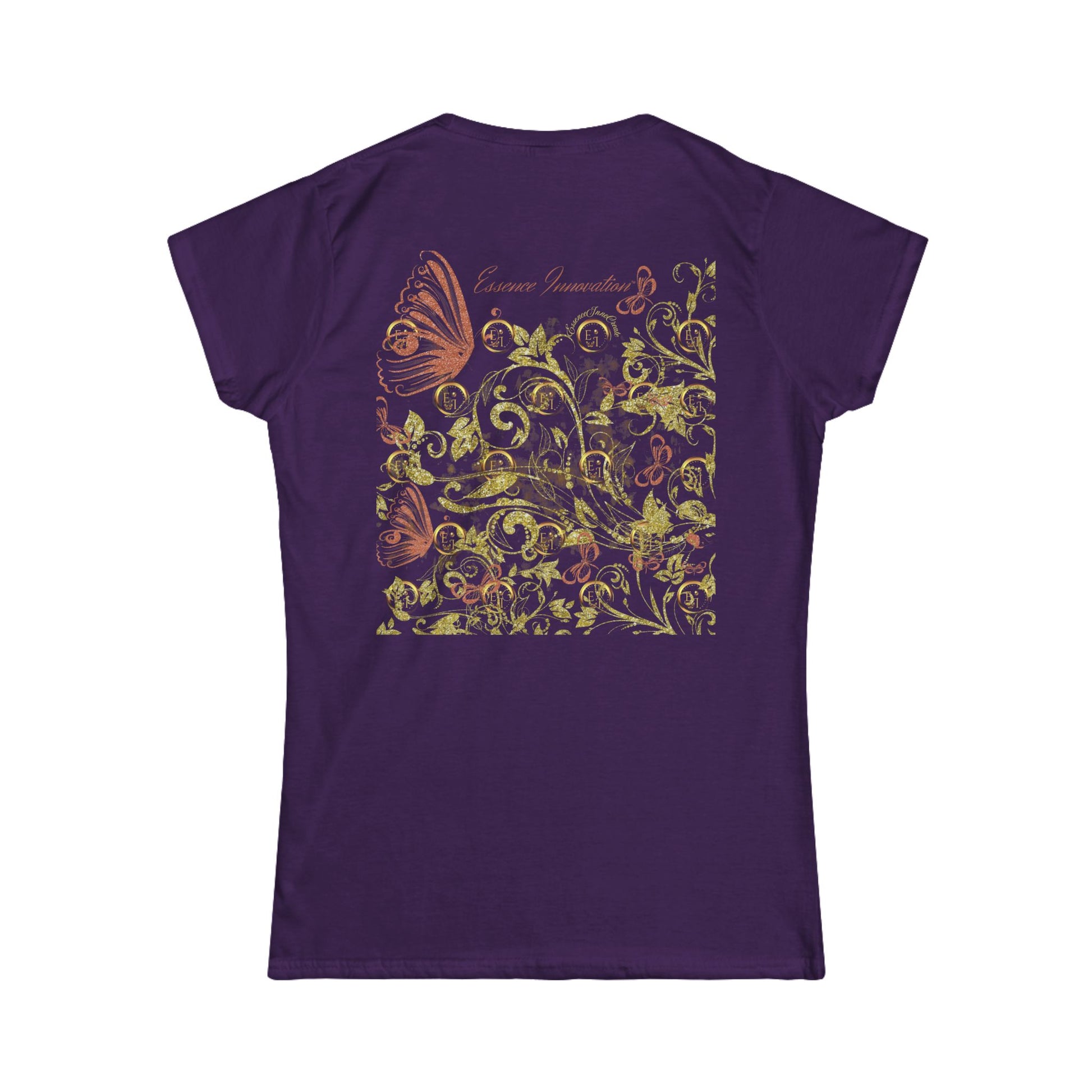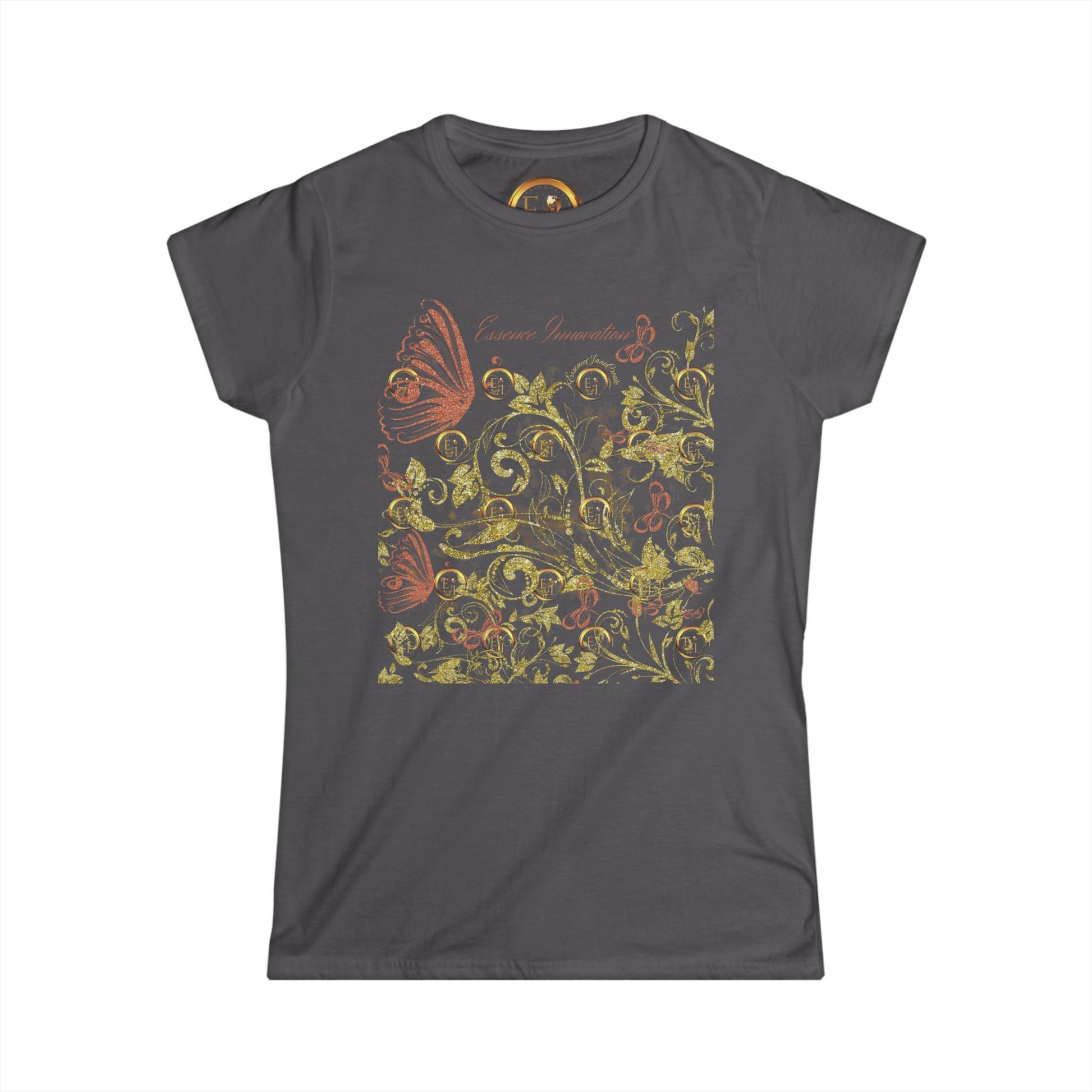 The Floral Butterfly T-Shirt | Elegant Nature Lovers captures elegance through artistry. Designed by EssenceInnoCreate, this tee pairs soft comfort with intricate golden florals and a butterfly motif that symbolize growth, creativity, and timeless femininity. The botanical artwork flows across both front and back, making every angle a story in nature-inspired beauty.