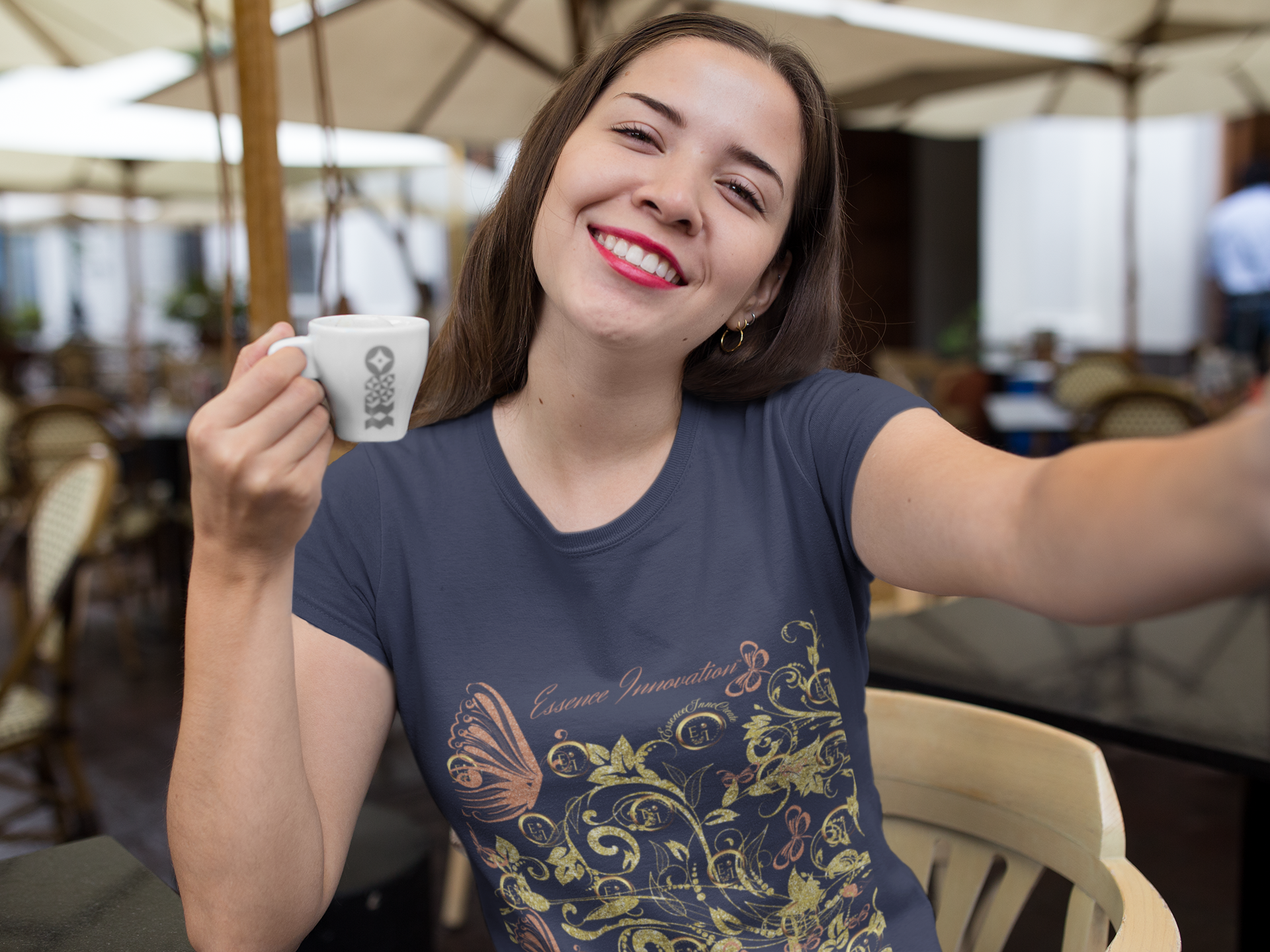 Find calm and confidence in the Floral Butterfly T-Shirt in Navy, a signature design from the EssenceInnoCreate collection. With its rich navy base and intricate golden florals, this tee offers a sophisticated take on nature-inspired fashion. A graceful butterfly rests among blooming vines, inviting a quiet strength and timeless femininity into your wardrobe.