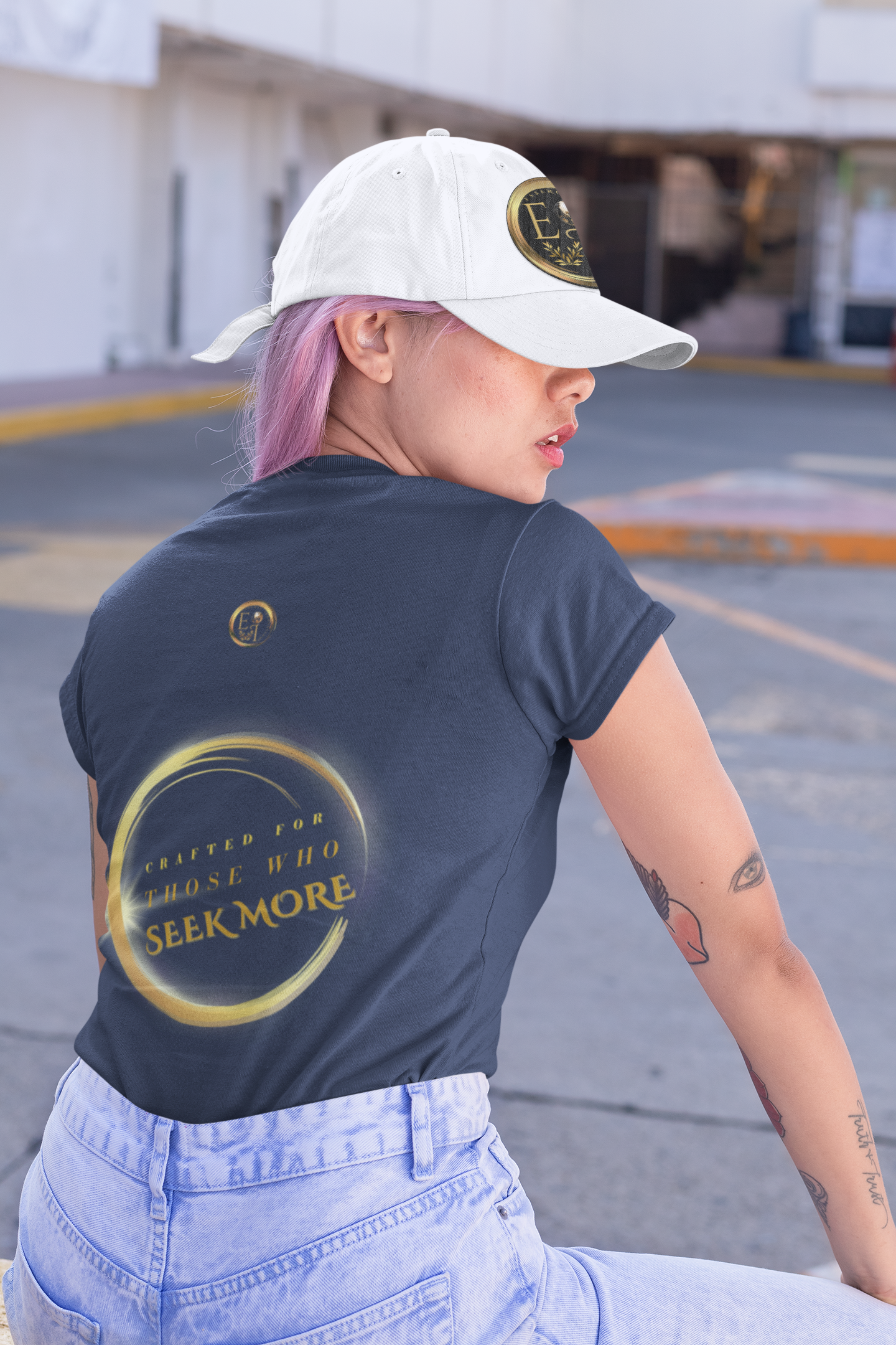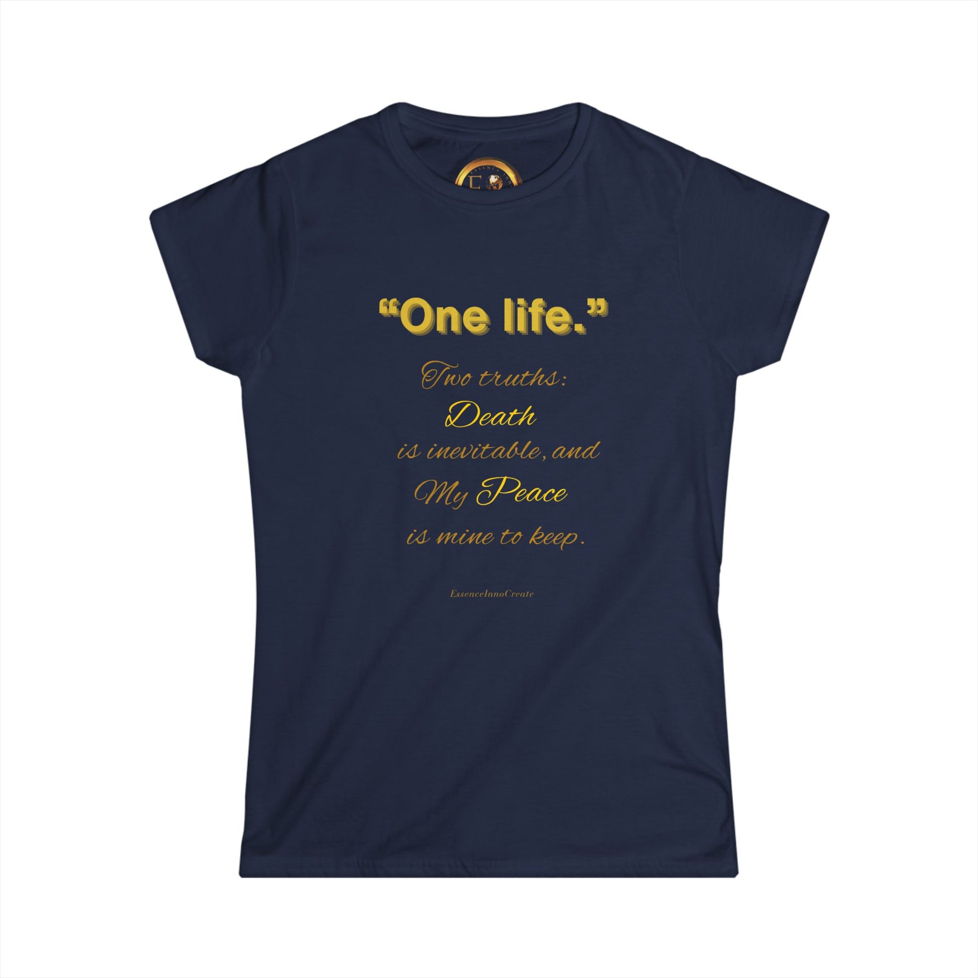 Turn it around, and the back carries the reminder “Crafted for Those Who Seek More” inside a circular gold emblem. This design reflects your growth, your stillness, and your commitment to peace. The One Life Tee in Navy makes your presence known—not through volume, but through intention.