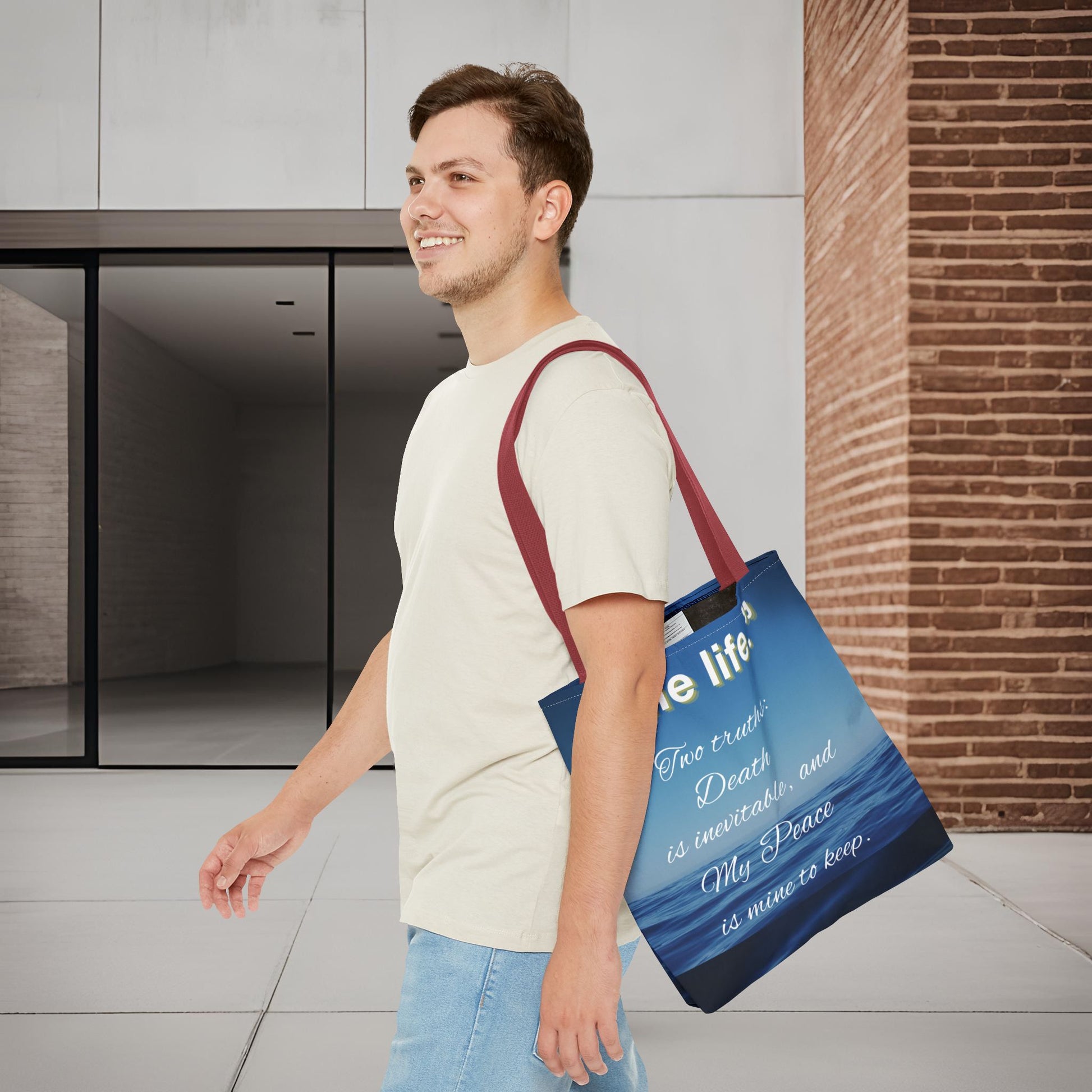 A roomy, durable tote that carries more than just your things — it carries intention. Featuring a tranquil ocean-at-dusk backdrop, this design holds a softly spoken truth: Death is inevitable, and My Peace is mine to keep. Rendered in flowing script across a deep blue sea, the message is personal, meditative, and quietly powerful.