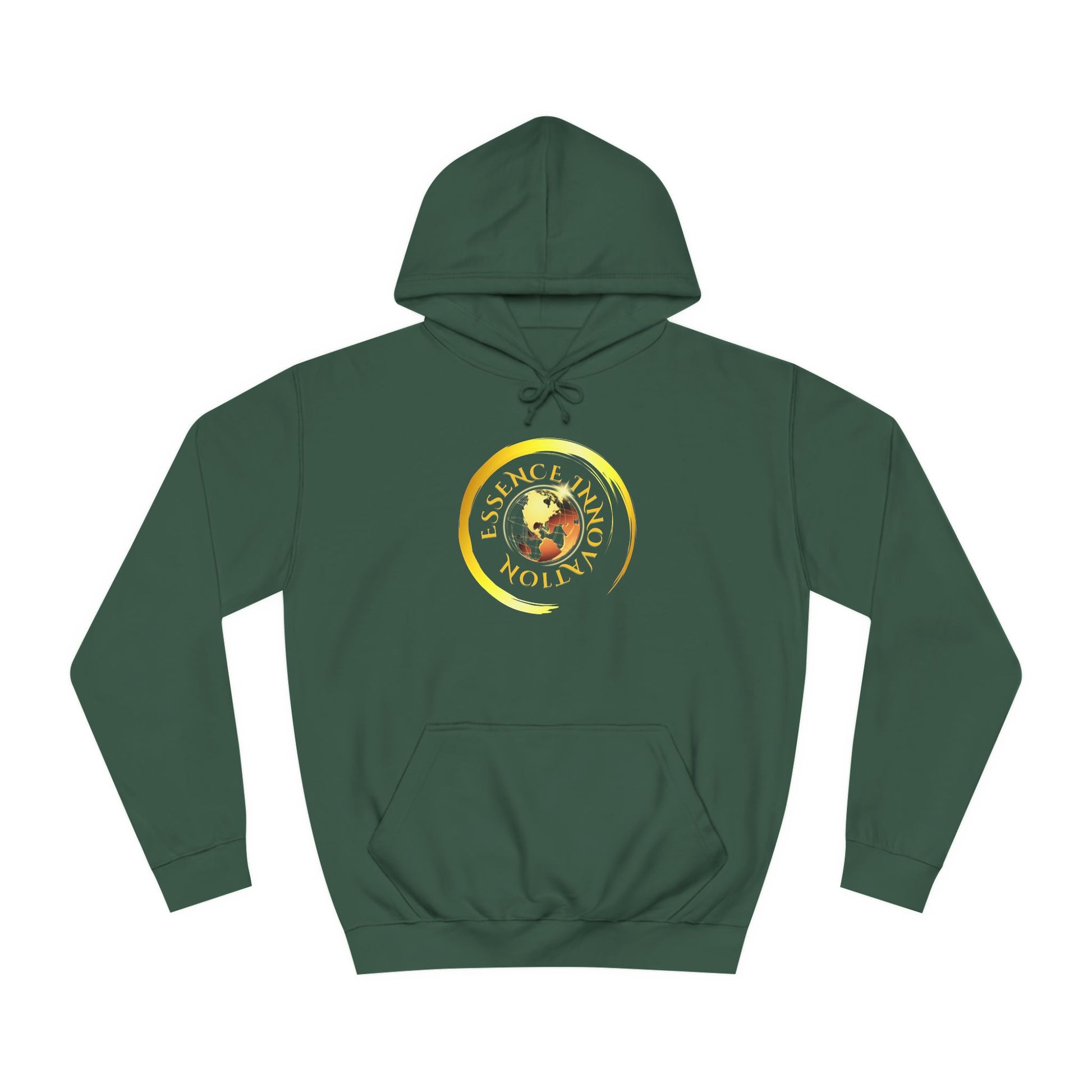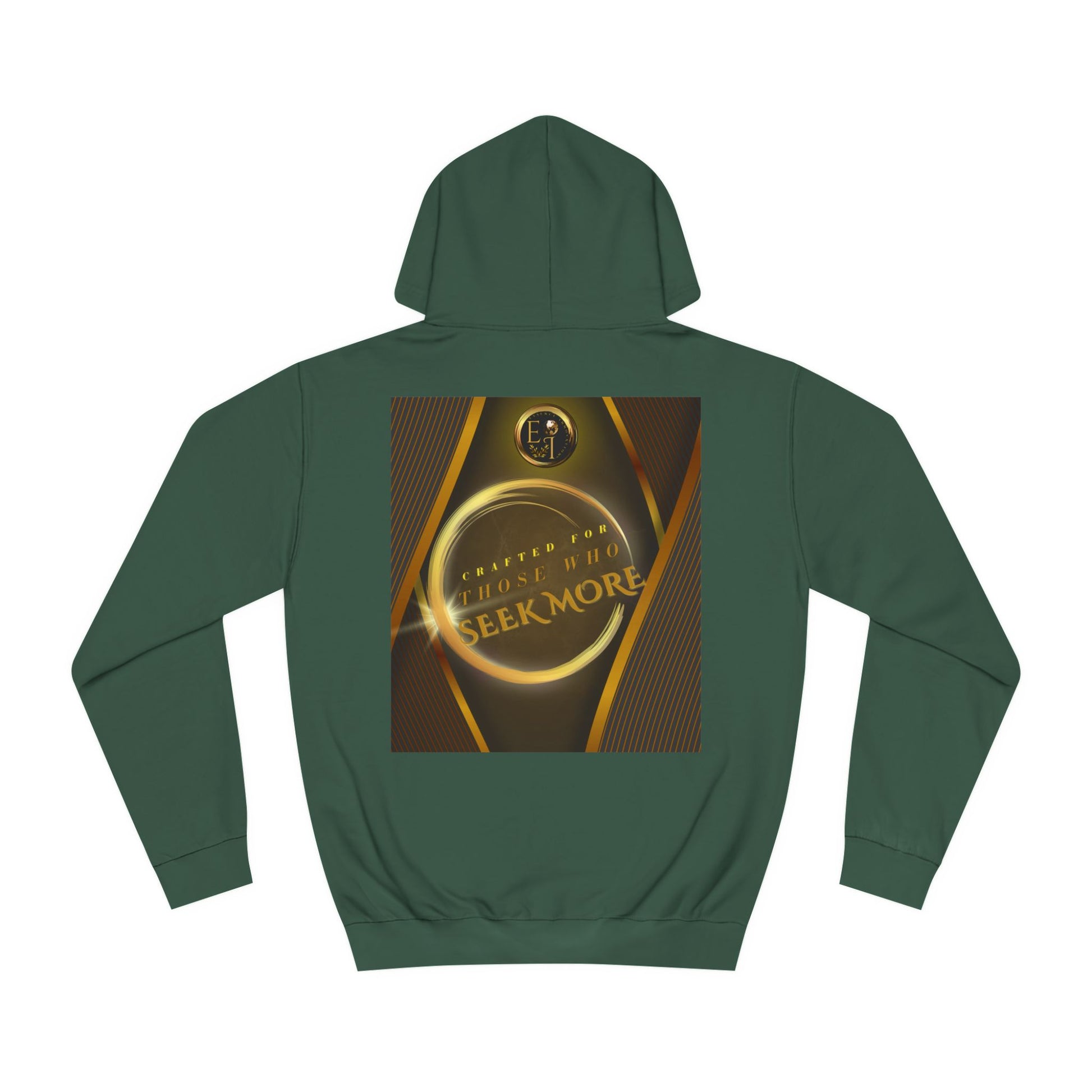 The front displays the iconic Essence Innovation logo in sleek golden tones, a bold symbol of innovation and aspiration. The back features the empowering phrase, “Crafted for Those Who Seek More,” highlighted in a golden motif inspired by nature and modern design. The Bottle Green color adds depth and elegance, making this hoodie both versatile and statement-worthy.
