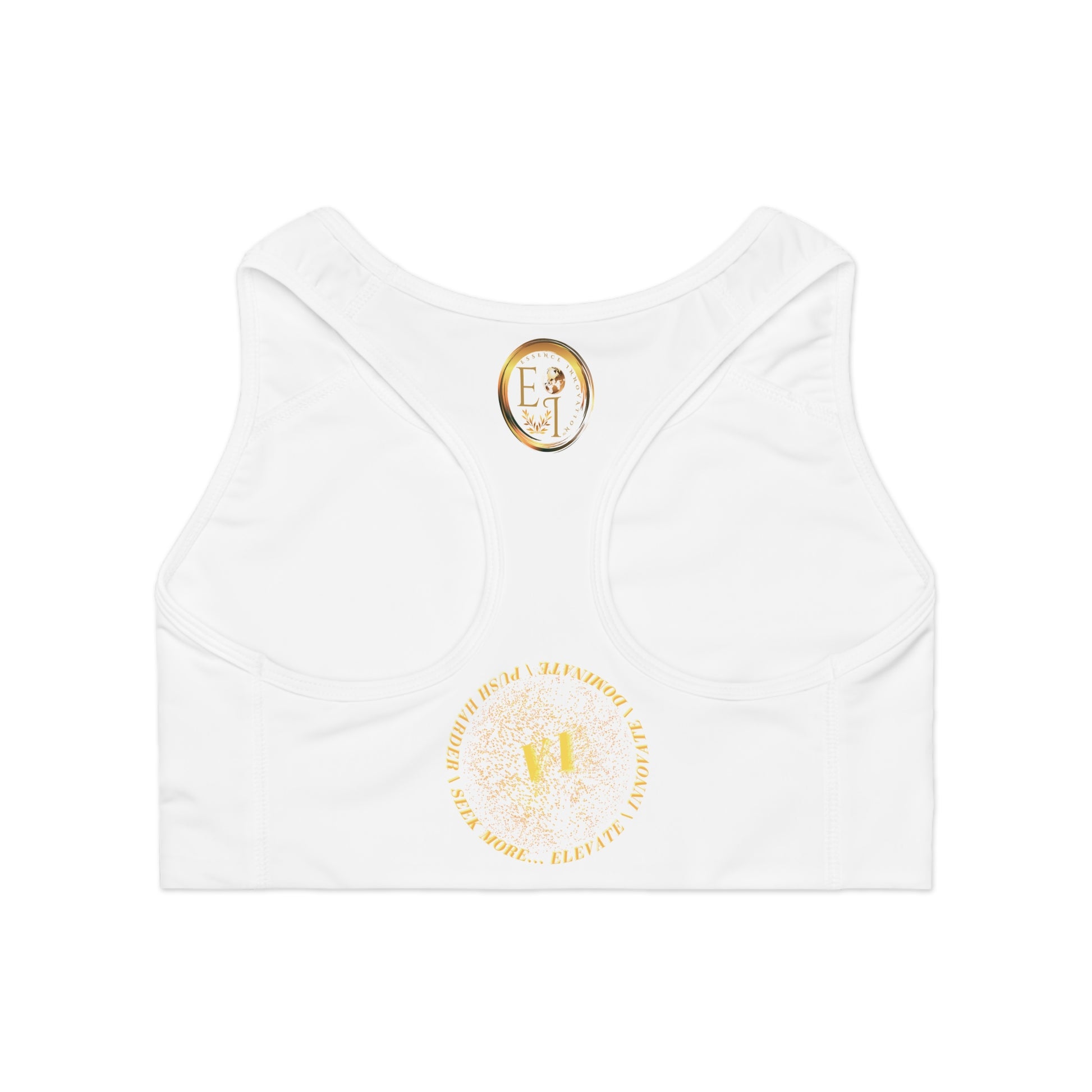 The crisp white base with metallic gold branding creates a sleek, modern aesthetic, symbolizing purity, strength, and focus. Featuring the Essence Innovation™ Elevate / Innovate / Dominate crest and Roman numeral VI on the back, this sports bra represents endurance and progression. Pair it with the Seek More BS VI Biker Shorts for a complete, high-performance look.