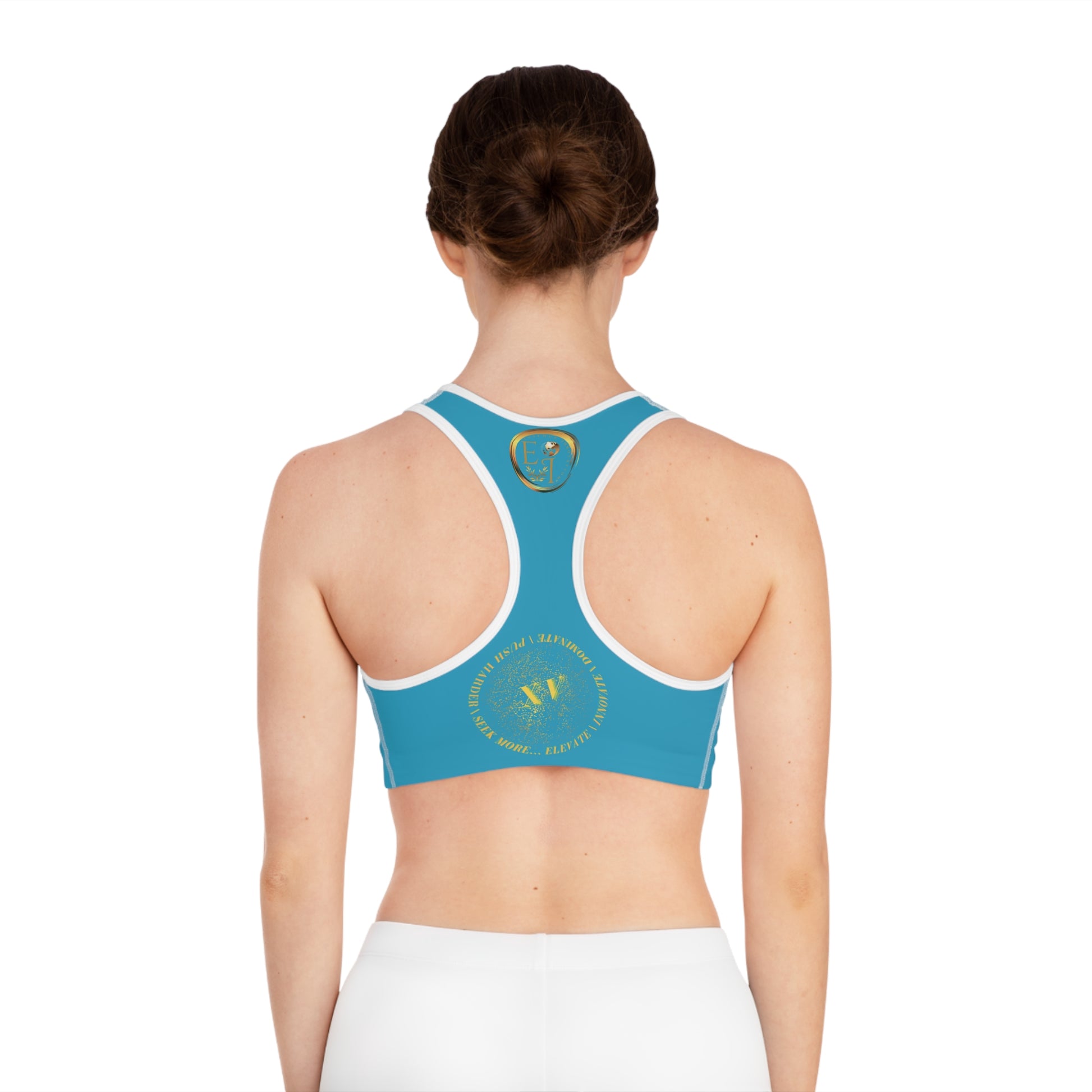 The vibrant turquoise base with metallic gold branding represents confidence, energy, and focus. Featuring the Elevate / Innovate / Dominate crest and Roman numeral XV on the back, this sports bra is a symbol of resilience and motion. Pair it with the Seek More BS XV Biker Shorts for a complete, performance-driven look.