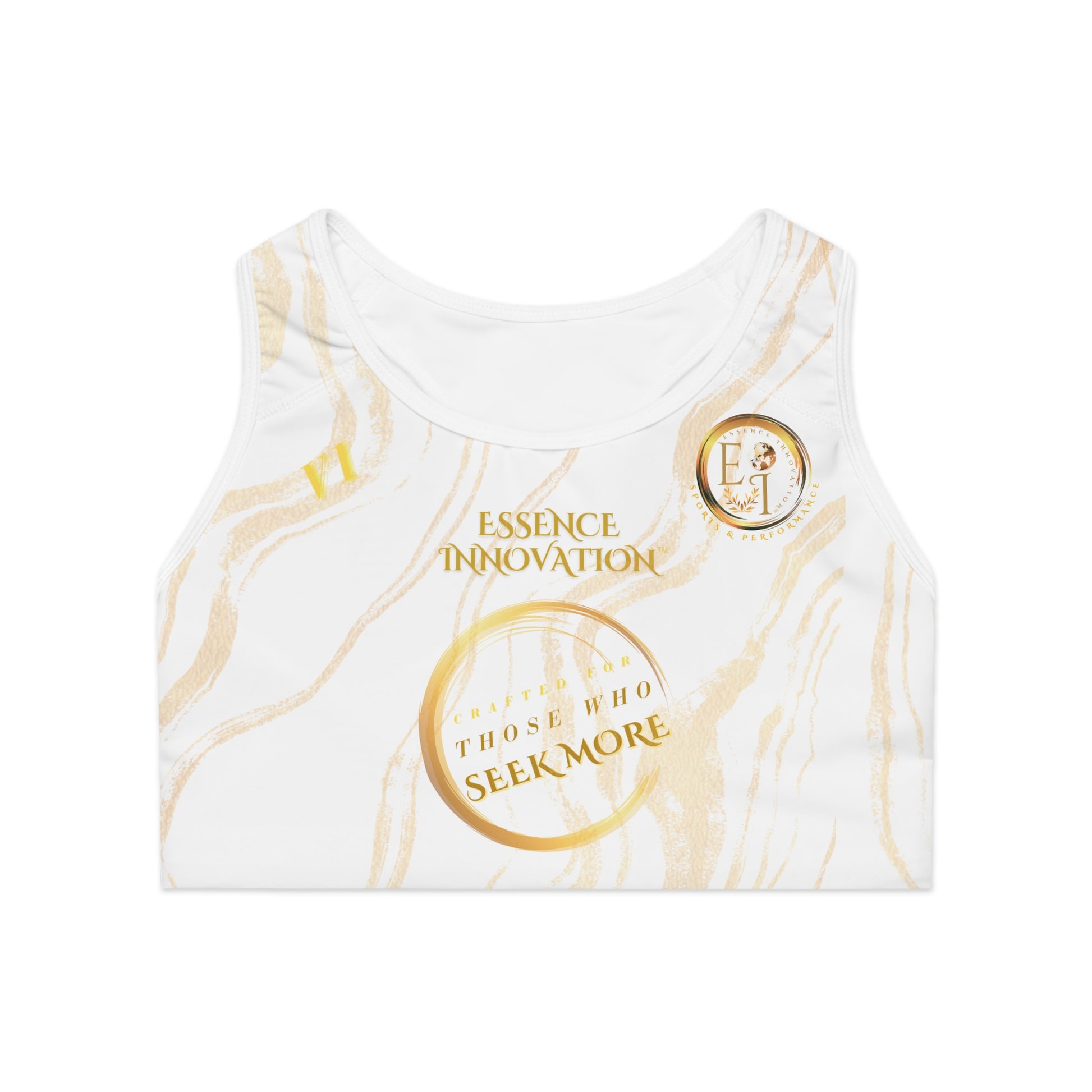 Stay strong, confident, and in control with the Seek More SBS VI Sports Bra in crisp white. Designed for athletes who demand performance and style, this sports bra features moisture-wicking fabric, compression support, and breathable comfort to keep you cool and focused. The gold marble striped detailing adds a bold yet refined aesthetic, while the Essence Innovation™ branding and crest symbolize precision, strength, and movement. Whether you're working out, competing, or styling it for athleisure, this sports bra blends performance with timeless elegance.
