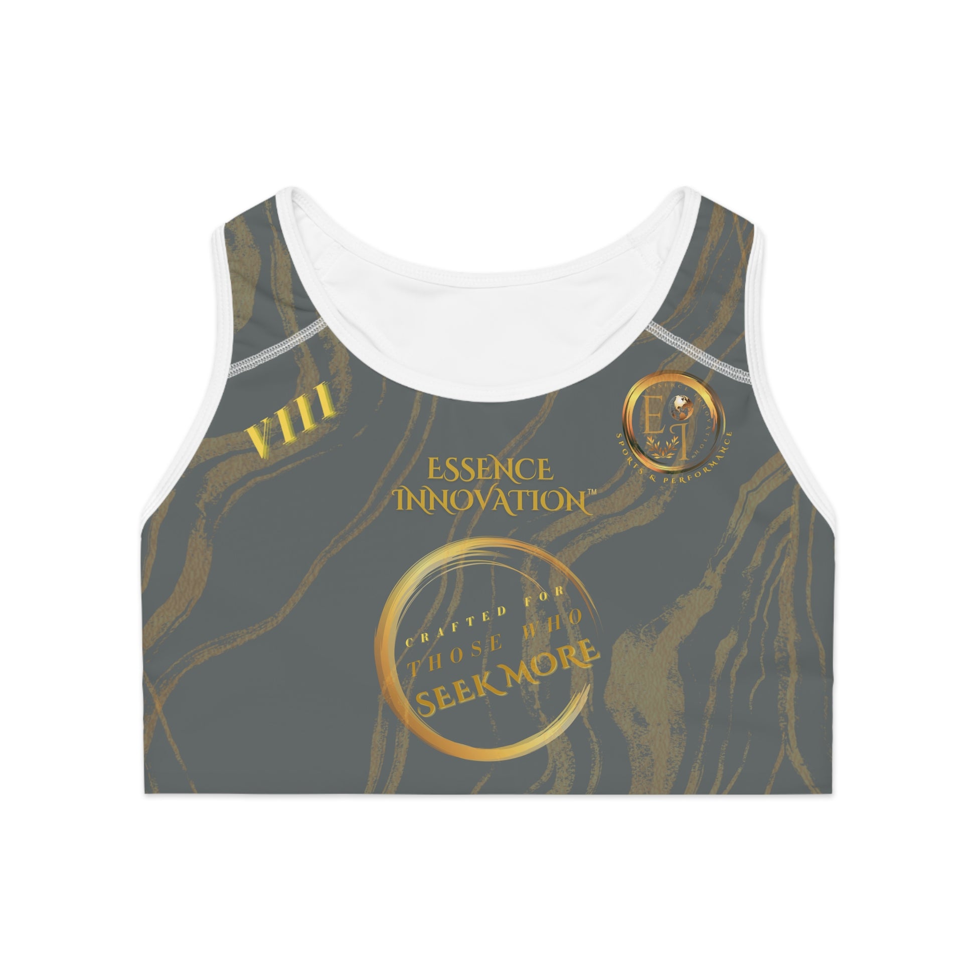 Stay focused and in control with the Seek More SBS VIII Sports Bra in sleek grey. Designed for athletes who demand performance and style, this sports bra offers moisture-wicking fabric, compression support, and breathable comfort to keep you locked in during every movement. The gold marble striped detailing enhances the modern, dynamic aesthetic, while the Essence Innovation™ branding and crest symbolize strength, movement, and precision. Whether training, competing, or styling for athleisure, this sports bra ensures ultimate support and flexibility.