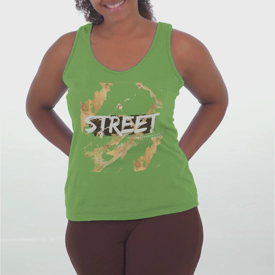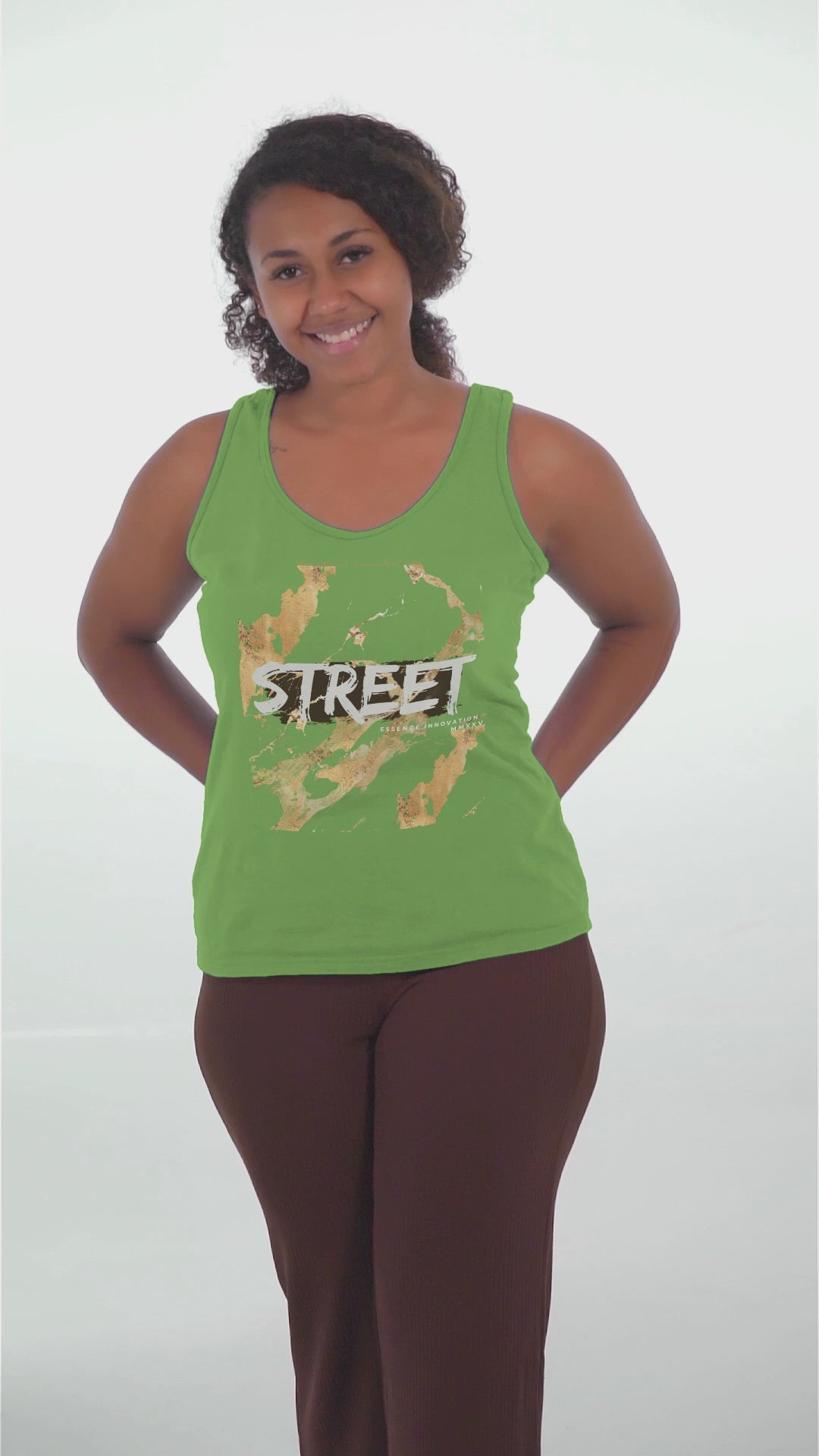 The STREET Gold Graffiti XXIV | Unisex Tank Top | Light Green captures vitality and resilience in one bold design. As part of the STREET Collection, this Humanity’s Values edition lifts up six timeless principles: Stand. Transform. Respect. Elevate. Empower. Trust. Distressed gold graffiti declares “STREET” across the front, while the burned-scroll design on the back reminds us that these values, though challenged, remain unbreakable.