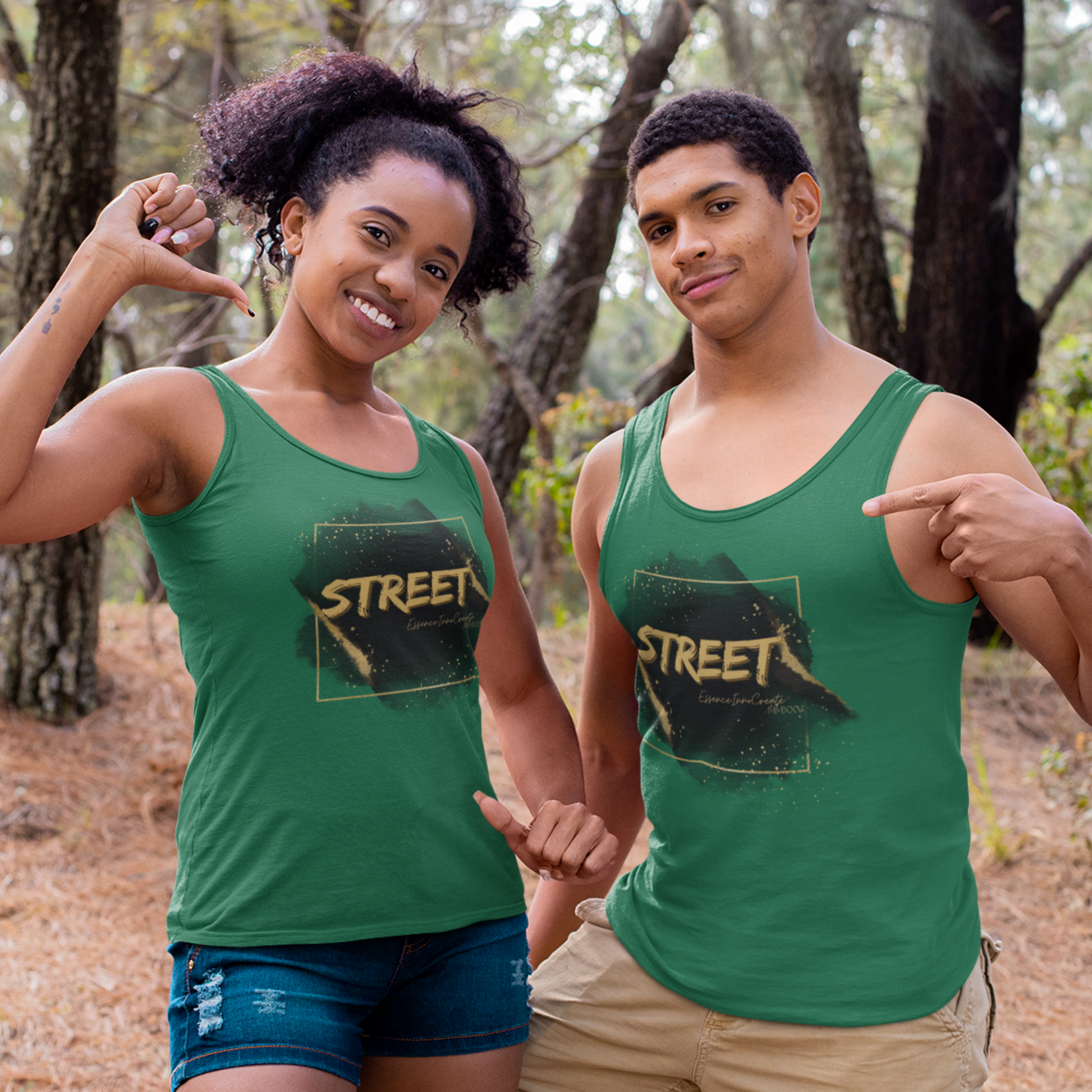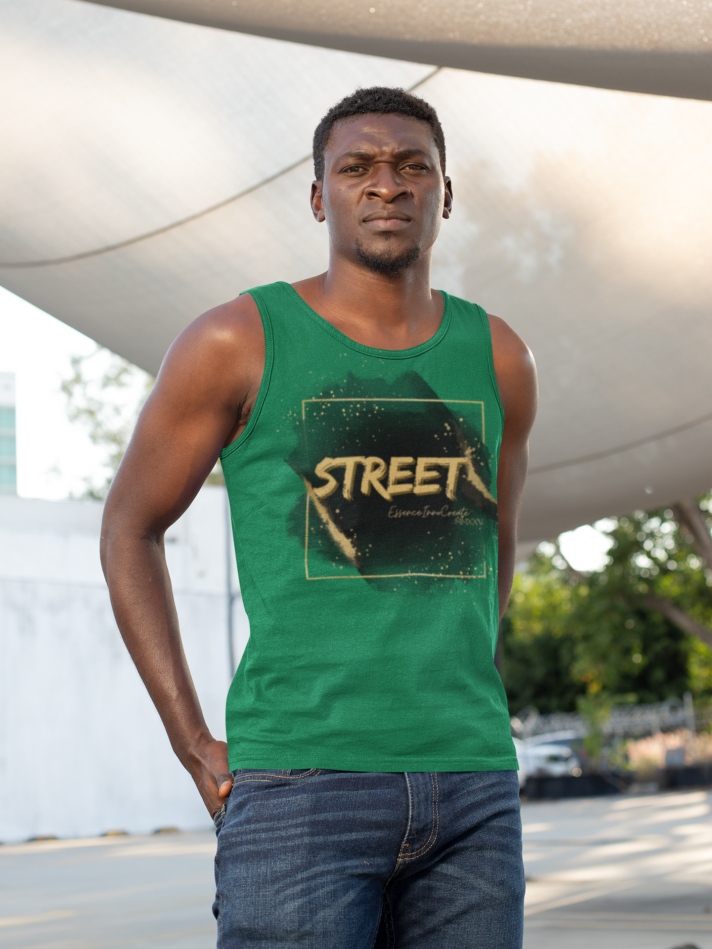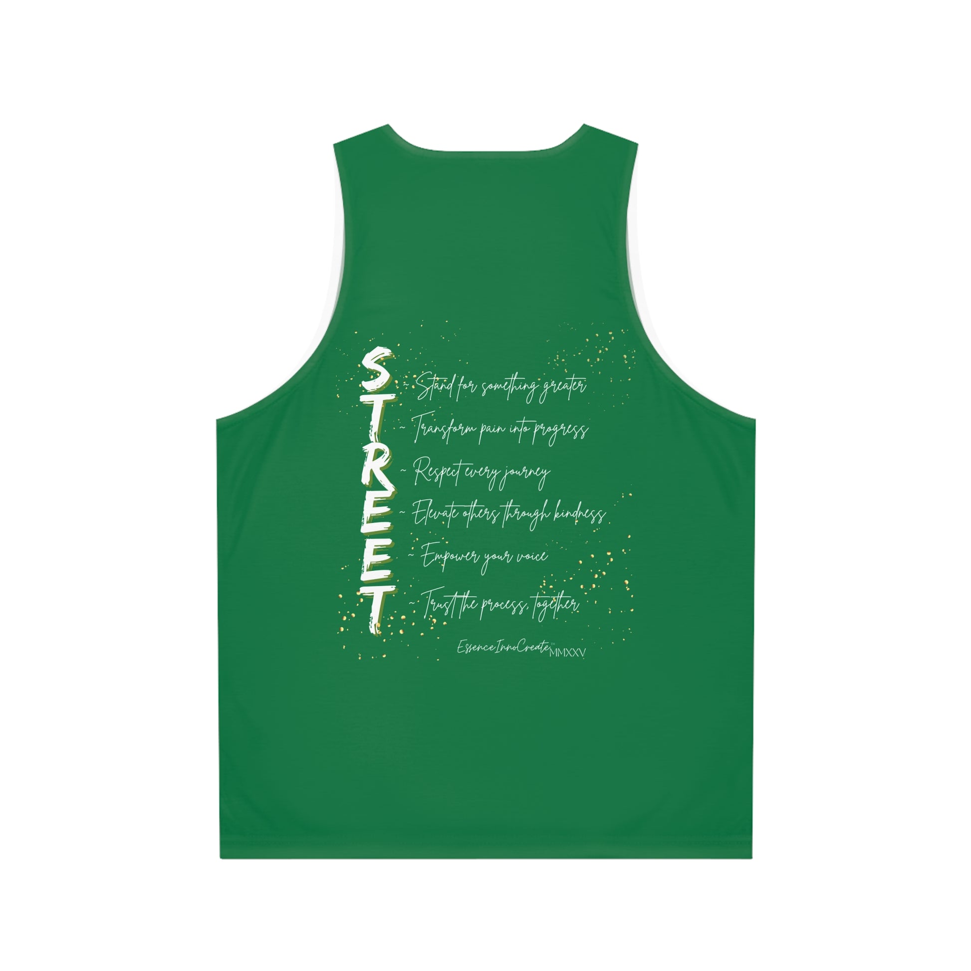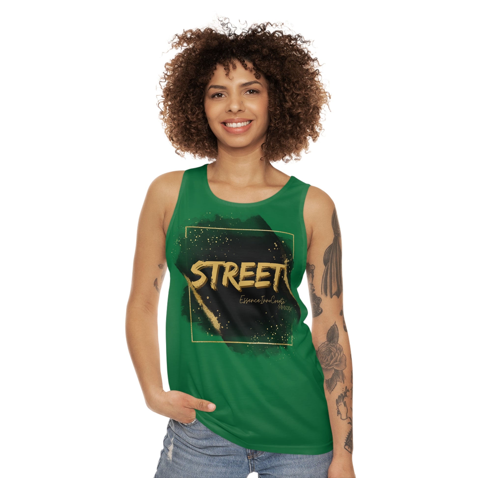 The Street Wear Tank XII | EssenceInnoCreate | Dark Green is a statement of balance and resilience. Its deep green base symbolizes grounded energy and quiet strength, making it one of the most versatile tones in the Street Wear series. On the front, the graffiti-style STREET graphic pops in distressed gold against the rich backdrop. On the back, the STREET values design carries its timeless reminder: