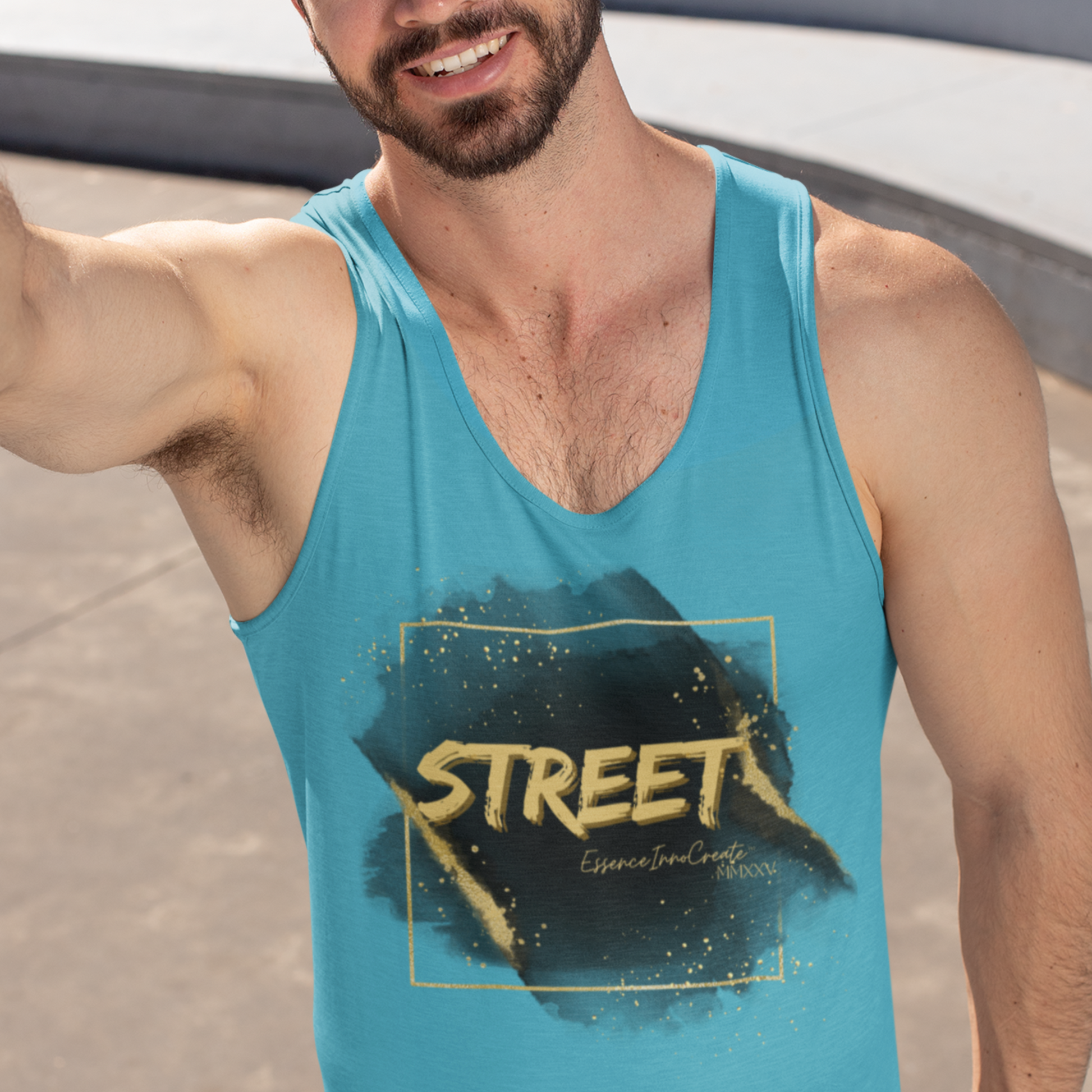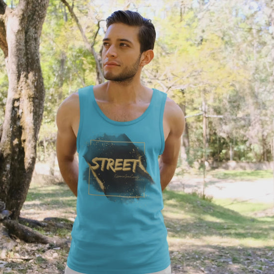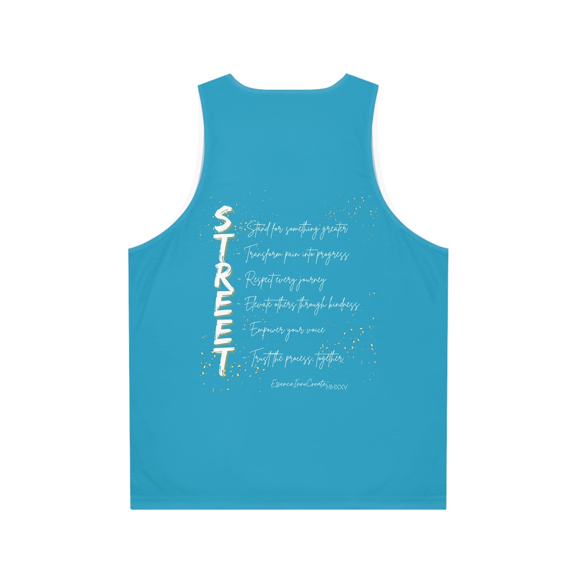 The Street Wear Tank XV | EssenceInnoCreate | Turquoise radiates energy, creativity, and fresh confidence. Its turquoise base brings a lively burst of color to the Street Wear series, pairing beautifully with the distressed gold graffiti STREET graphic on the front. On the back, the STREET values message takes form in white with gold flakes, reminding us to live by six core principles: