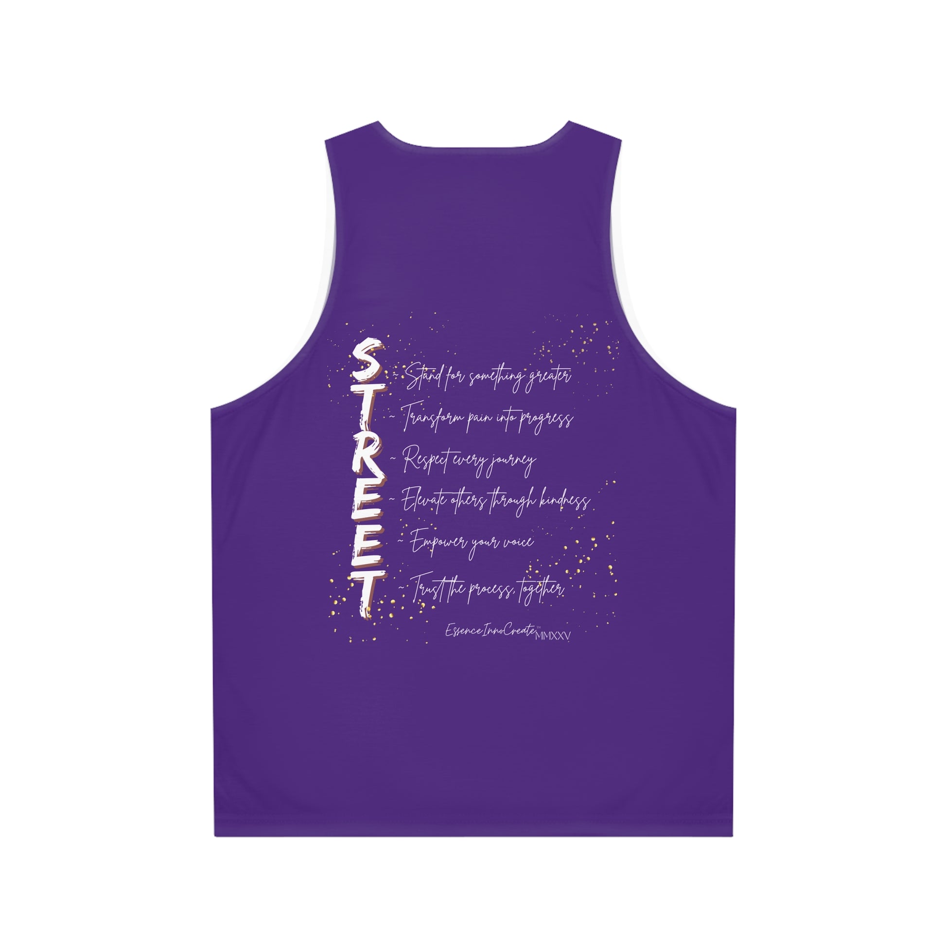 The Street Wear Tank XVI | EssenceInnoCreate | Purple brings expressive style to the Street Wear series. Its rich purple base highlights individuality and artistic strength, offering a canvas for the distressed gold graffiti STREET graphic on the front. On the back, the STREET values design delivers its message in white with gold flakes:
