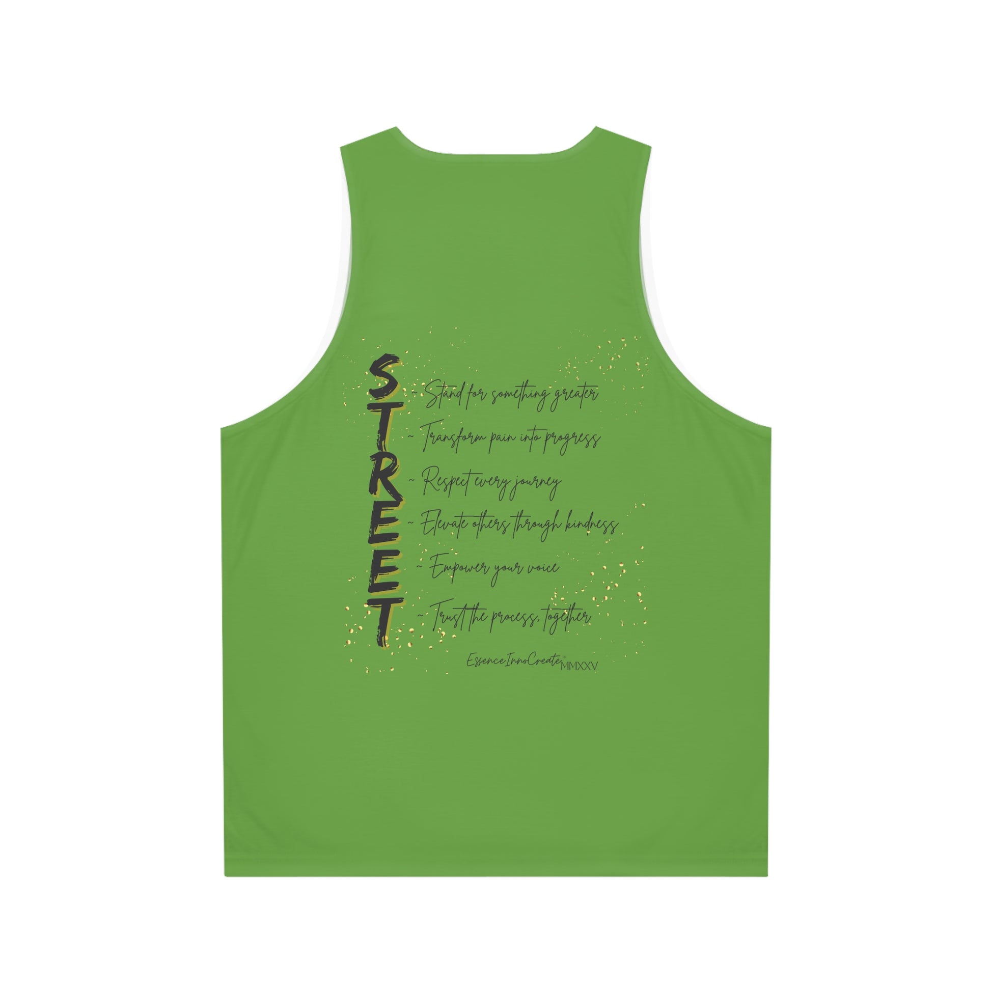 The Street Wear Tank XXIV | EssenceInnoCreate | Light Green captures vitality and renewal. Its refreshing green base sets the stage for the distressed gold graffiti STREET graphic on the front, creating a look that feels alive with movement. On the back, the STREET values design—printed in deep charcoal with gold flakes—delivers the enduring principles of the series: